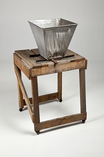 Home made grape crusher, known as a Macinano, it was probably made by a friend of the di Benedetto family in the 1960s. It was used in domestic wine production by the Di Benedetto family at their home in Thornbury, from the 1960s to 1991. In the early years the wine making was very much a family affair, with everyone contributing to the annual ritual. As the family dispersed, Vito di Benedetto continued to make wine once every three years, with the assistance of Maria and often his daughter Angela, until his death in 1991.