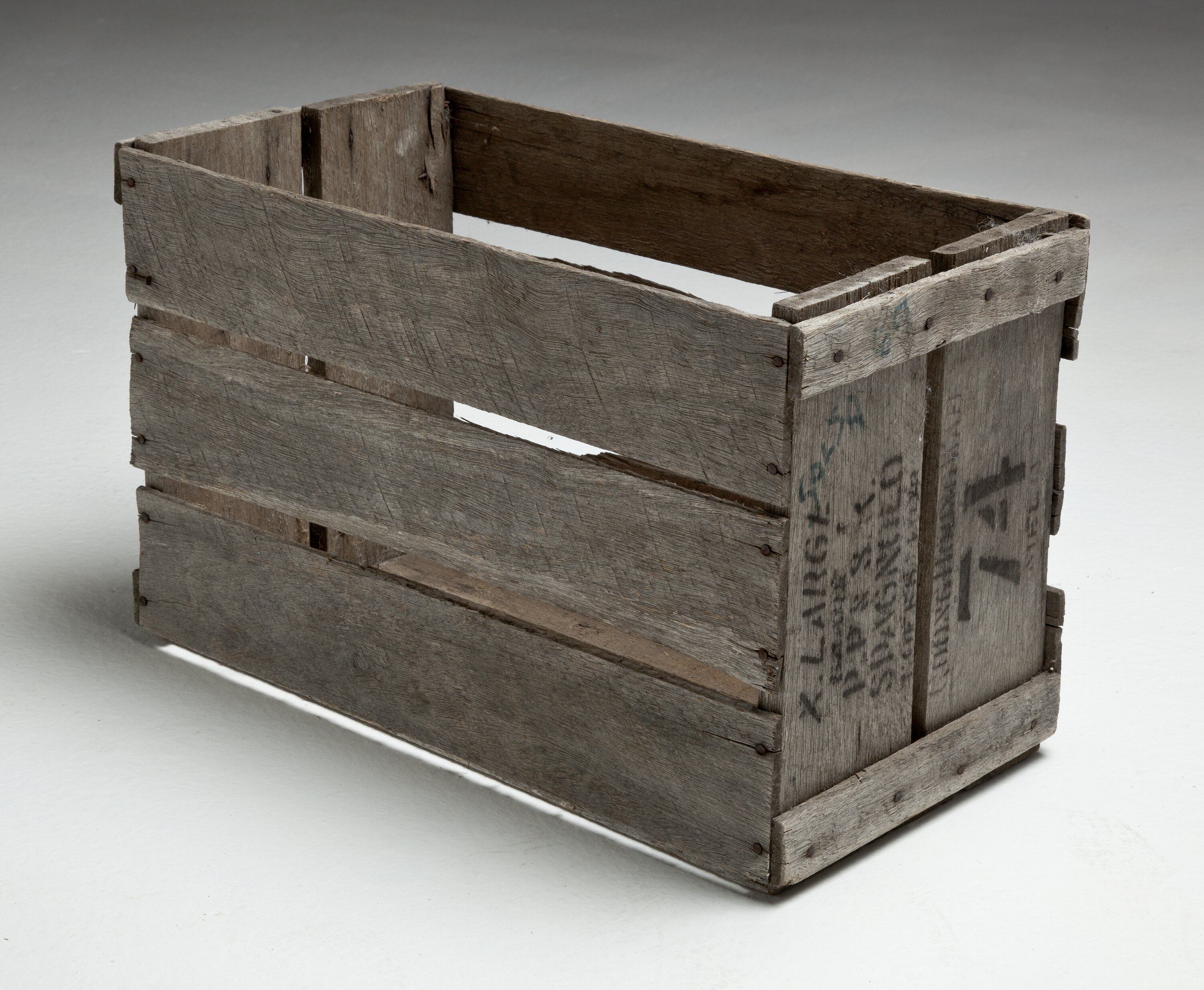 Wooden crate made from three slats at bottom, three horizontal slats on each of the longer sides, and two vertical slats on each of the shorter ends.