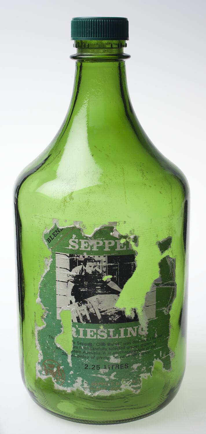 Round glass bottle, circa 1960s-1990s. It was used in domestic wine production by the Di Benedetto family at their home in Thornbury, from the 1960s to 1991. In the early years the wine making was very much a family affair, with everyone contributing to the annual ritual. As the family dispersed, Vito di Benedetto continued to make wine once every three years, with the assistance of Maria and often his daughter Angela, until his death in 1991.