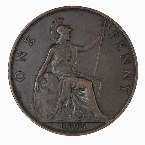Britannia seated facing right on a rock wearing a helmet and flowing robes; she holds a trident and rests her right hand on a shield which bears the combined crosses of the Union Flag; around, ONE PENNY; in exergue, 1895