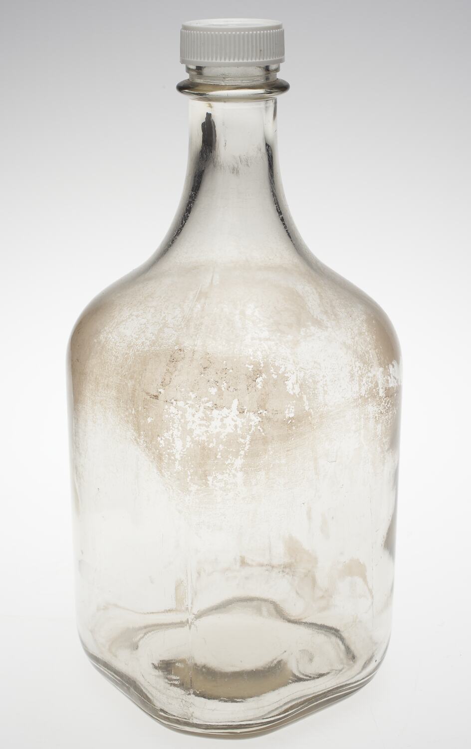 Clear square glass bottle, circa 1960s-1990s. It was used in domestic wine production by the Di Benedetto family at their home in Thornbury, from the 1960s to 1991. In the early years the wine making was very much a family affair, with everyone contributing to the annual ritual. As the family dispersed, Vito di Benedetto continued to make wine once every three years, with the assistance of Maria and often his daughter Angela, until his death in 1991.
