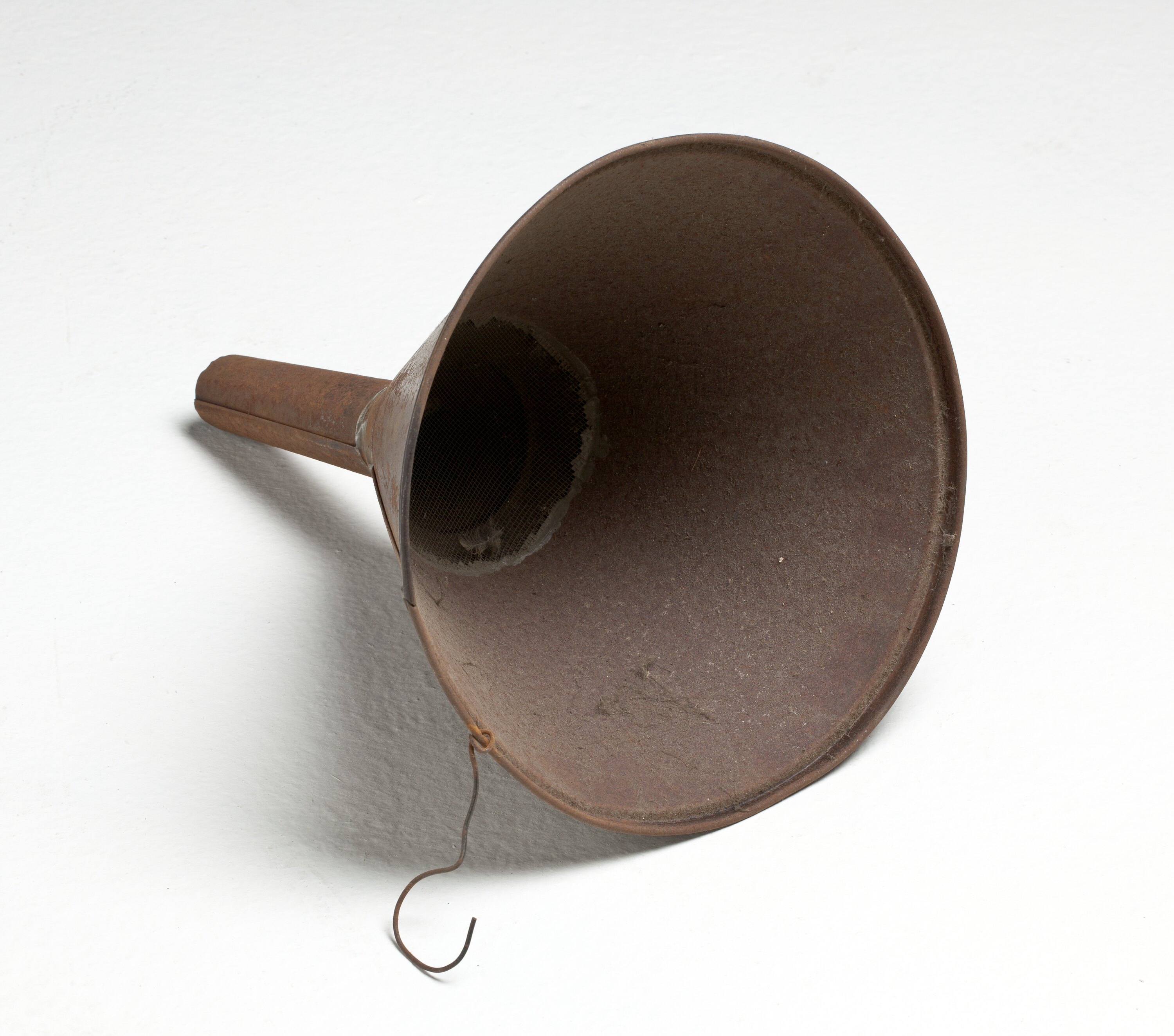 Rusted metal funnel with wire mesh inside for straining. Wire hook attached to rim.