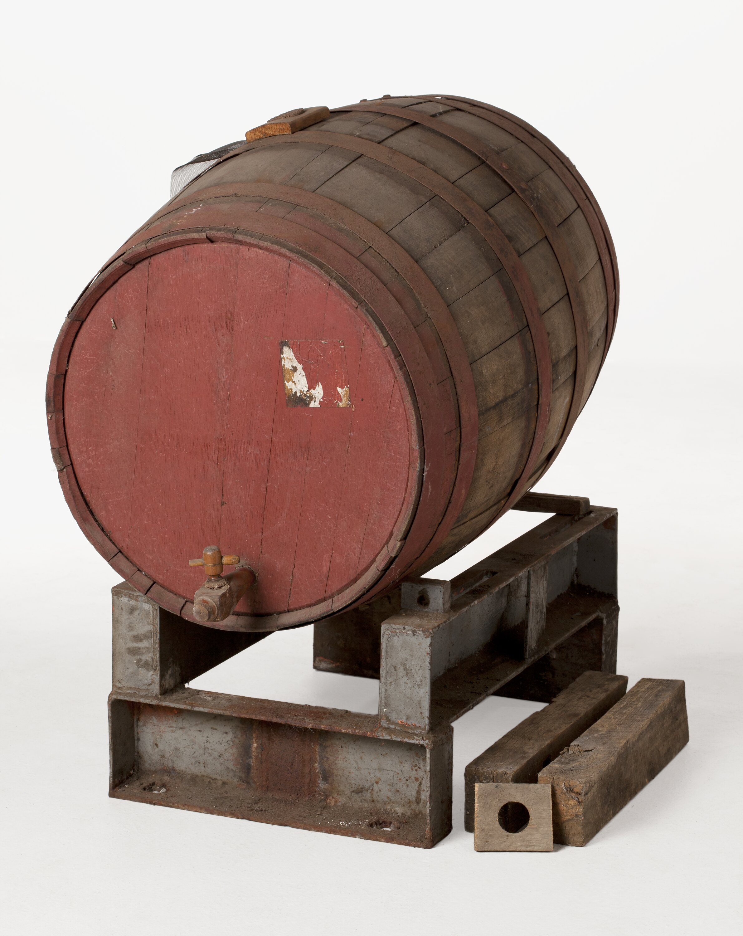 Wooden barrel on stand. The barrel is made from vertical planks, bound horizontally with metal hoops and bearing a wooden tap at top. There is a hole at one side, with a piece of gauze attached nearby. The stand is constructed of four metal members, each with a cross section of a right-angled-C. Two shorter members form the bottom edges, and are topped by two longer members resting corner-to-corner and welded together.