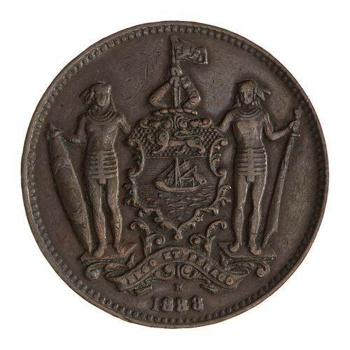 Shield of arms of the British North Borneo Company; on shield, a lion above a dhow; native warrior supporters one holding a shield the other as large machete; the crest, two arms holding a flag staff; below on ribbon the motto PERGO ET PERAGO (translation: I undertake and I achieve); below, 1888; the mint mark, H, above the date