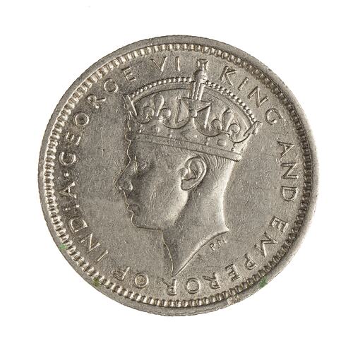 Crowned head of George VI left; around, GEORGE VI KING AND EMPEROR OF INDIA; artist's initials, PM, below neck