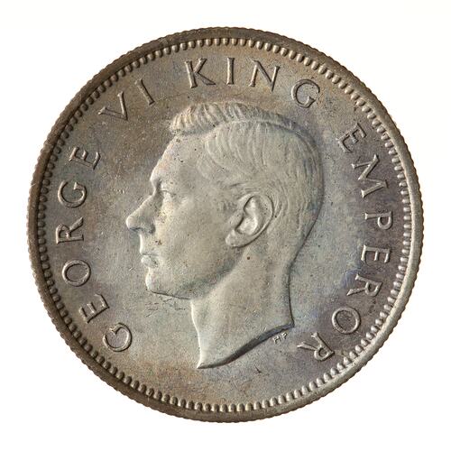 King's head, bare, facing left; around, GEORGE VI KING EMPEROR; below neck truncation in small letters the artist's initials HP ([Thomas] Humphrey Paget)