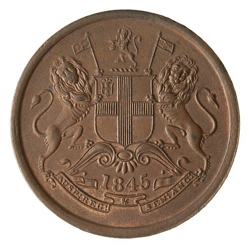 East India Company arms, a shield quartered with eschutcheon of France and England in the first quarter; crest of a lion rampant guardant holding between his forepaws the imperial crown proper; with supporters two lions rampant guardant each supporting a banner charged with a cross; below on a ribbon the motto, 'AUSP: REG: & SEN: ANG:' (translation: under the auspices of the king and senate of England); above ribbon, '1845'.