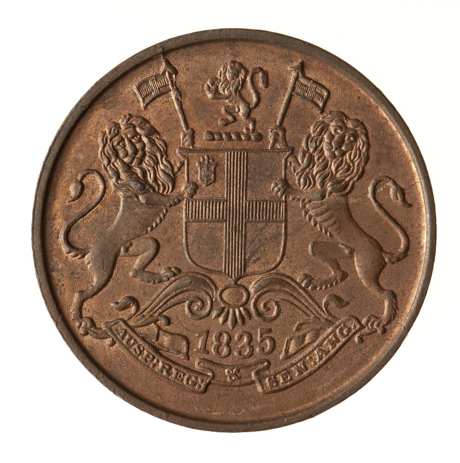 East India Company arms, a shield quartyered with eschutcheon of France and England in the first quarter; crest of a lion rampant guardant holding between his forepaws the imperial crown proper; with supporters two lions rampant guardant each supporting a banner charged with a cross; below on a ribbon the motto, 'AUSP: REG: & SEN: ANG:' (translation: under the auspices of the king and senate of England); above ribbon, '1835'.