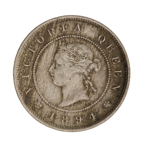 Within a beaded circle, a diademed head of the Queen facing left; around, VICTORIA QUEEN; below between two roses, 1894
