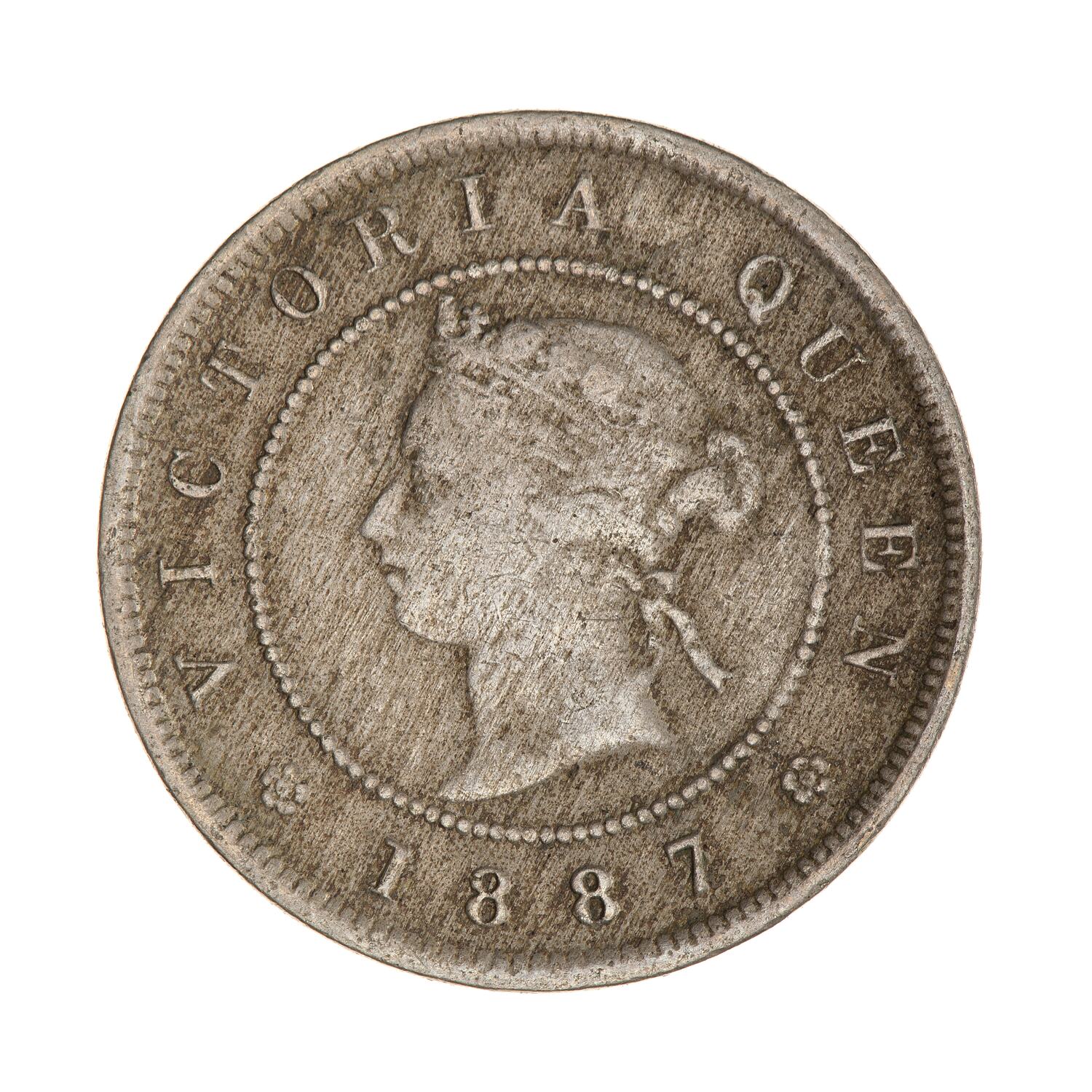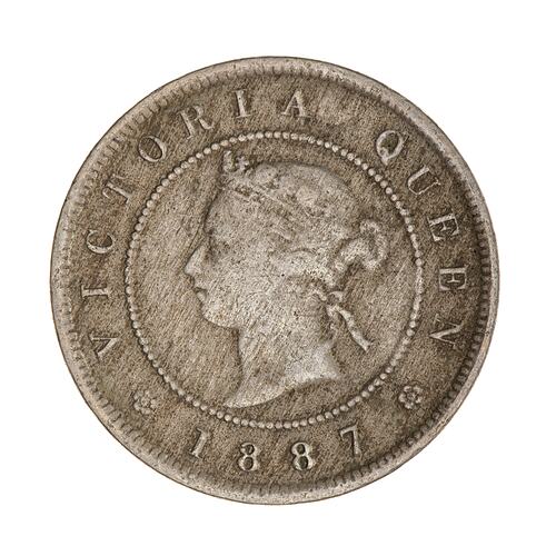 Within a beaded circle, a diademed head of the Queen facing left; around, VICTORIA QUEEN; below between two roses, 1887