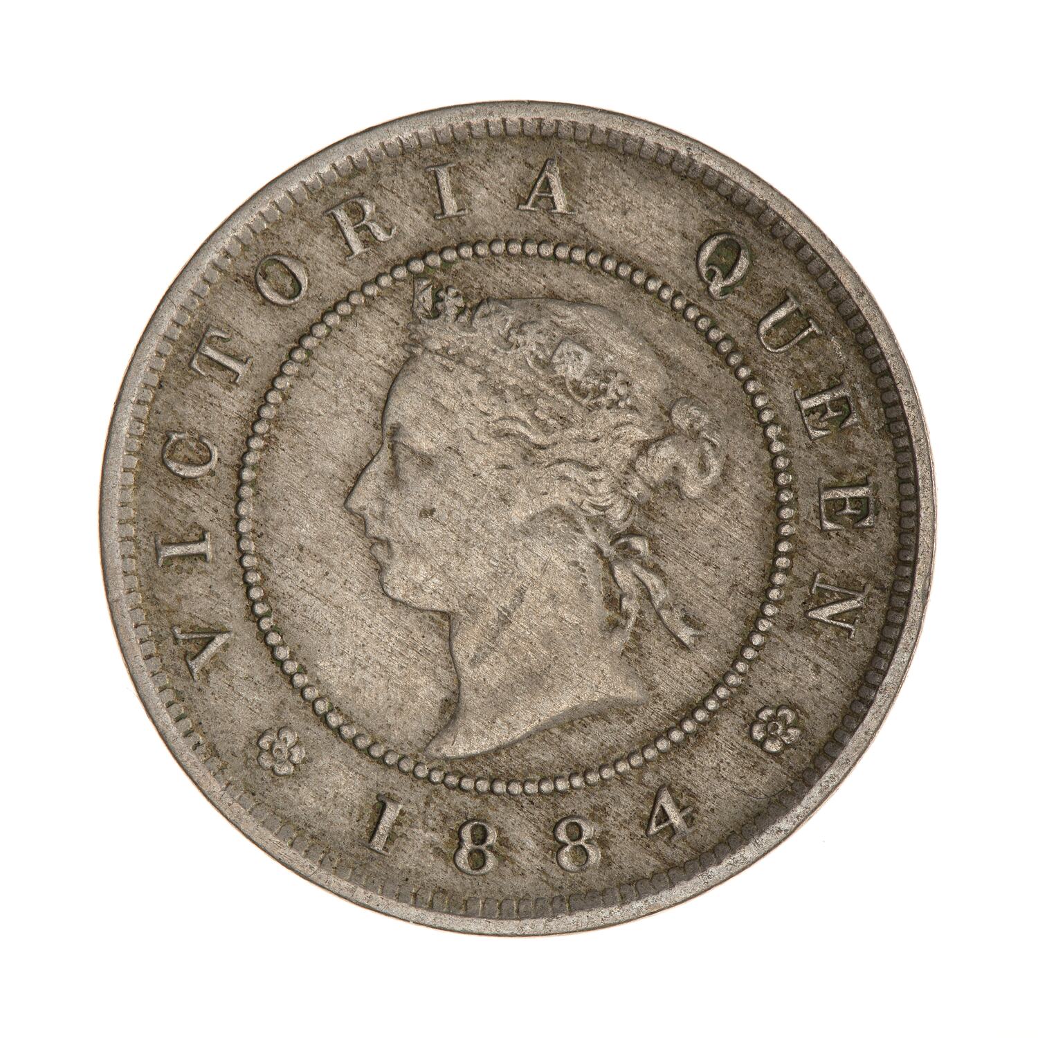 Within a beaded circle, a diademed head of the Queen facing left; around, VICTORIA QUEEN; below between two roses, 1884