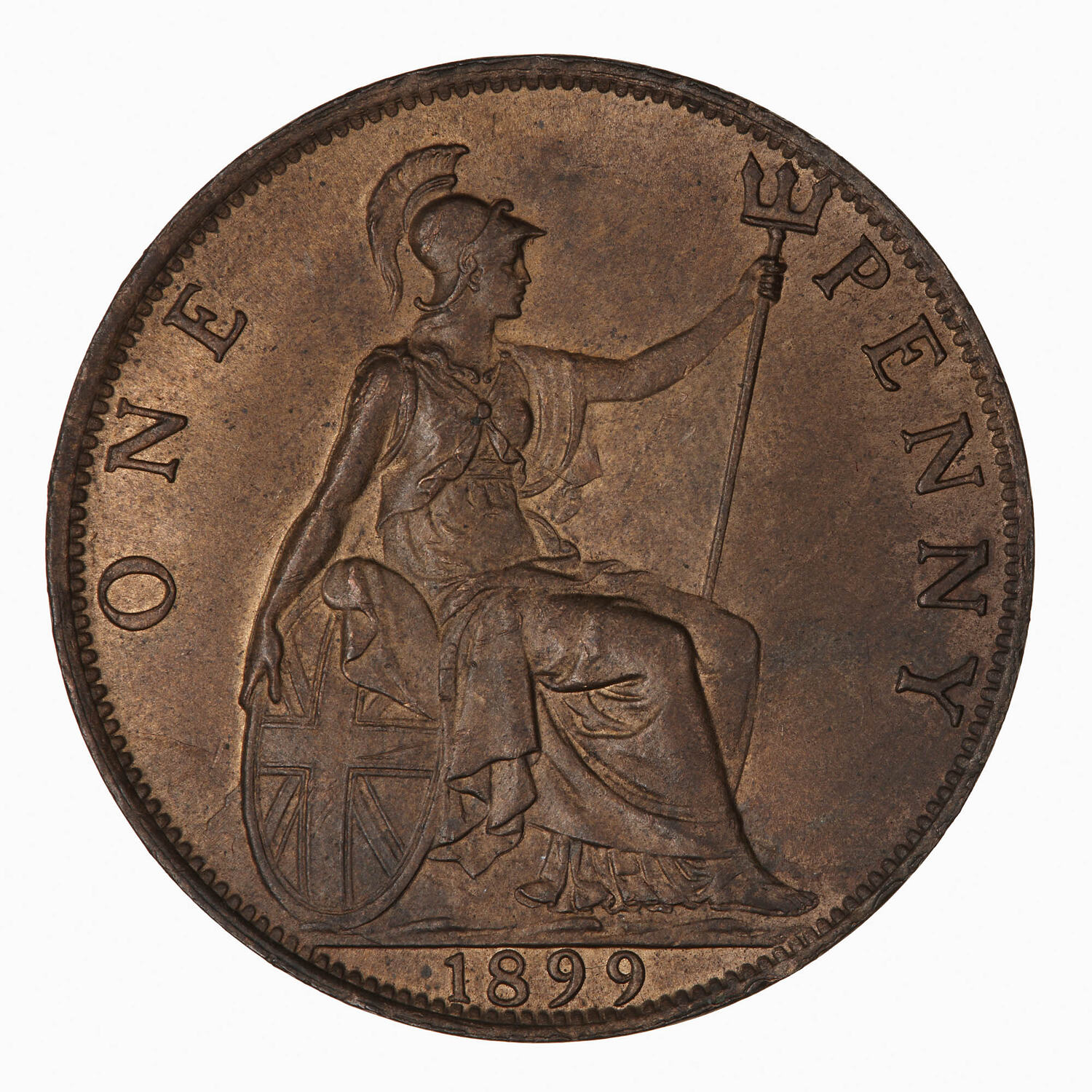Britannia seated facing right on a rock wearing a helmet and flowing robes; she holds a trident and rests her right hand on a shield which bears the combined crosses of the Union Flag; around, ONE PENNY; in exergue, 1899