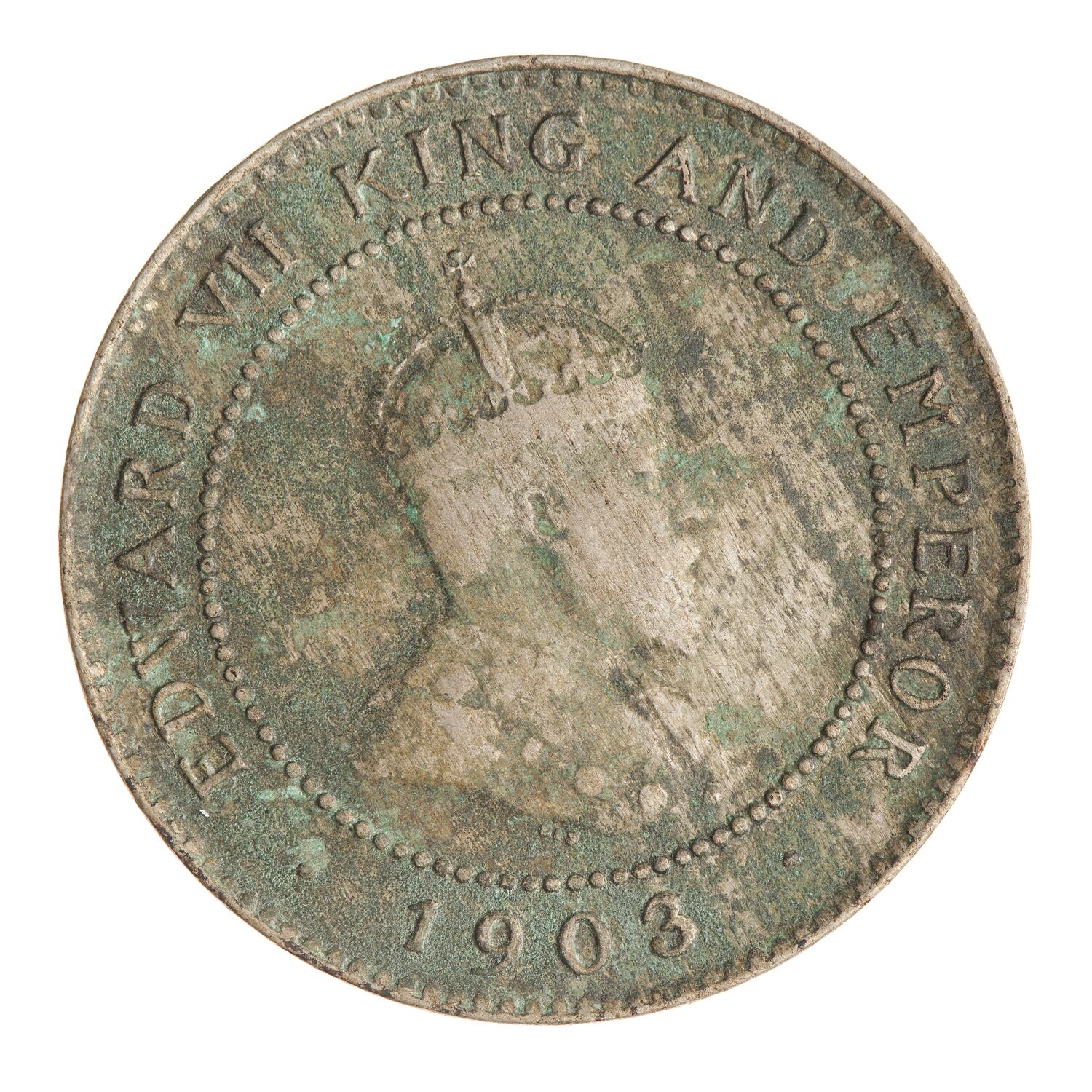 Crowned and draped bust of the King facing right, the King is wearing the Imperial Crown and the ermine Robe of State, the Collar of the Most Honourable Order of the Bath; around, EDWARD VII KING AND EMPEROR; below between two beads, 1903; below the bust truncation, the artist's initials, DES