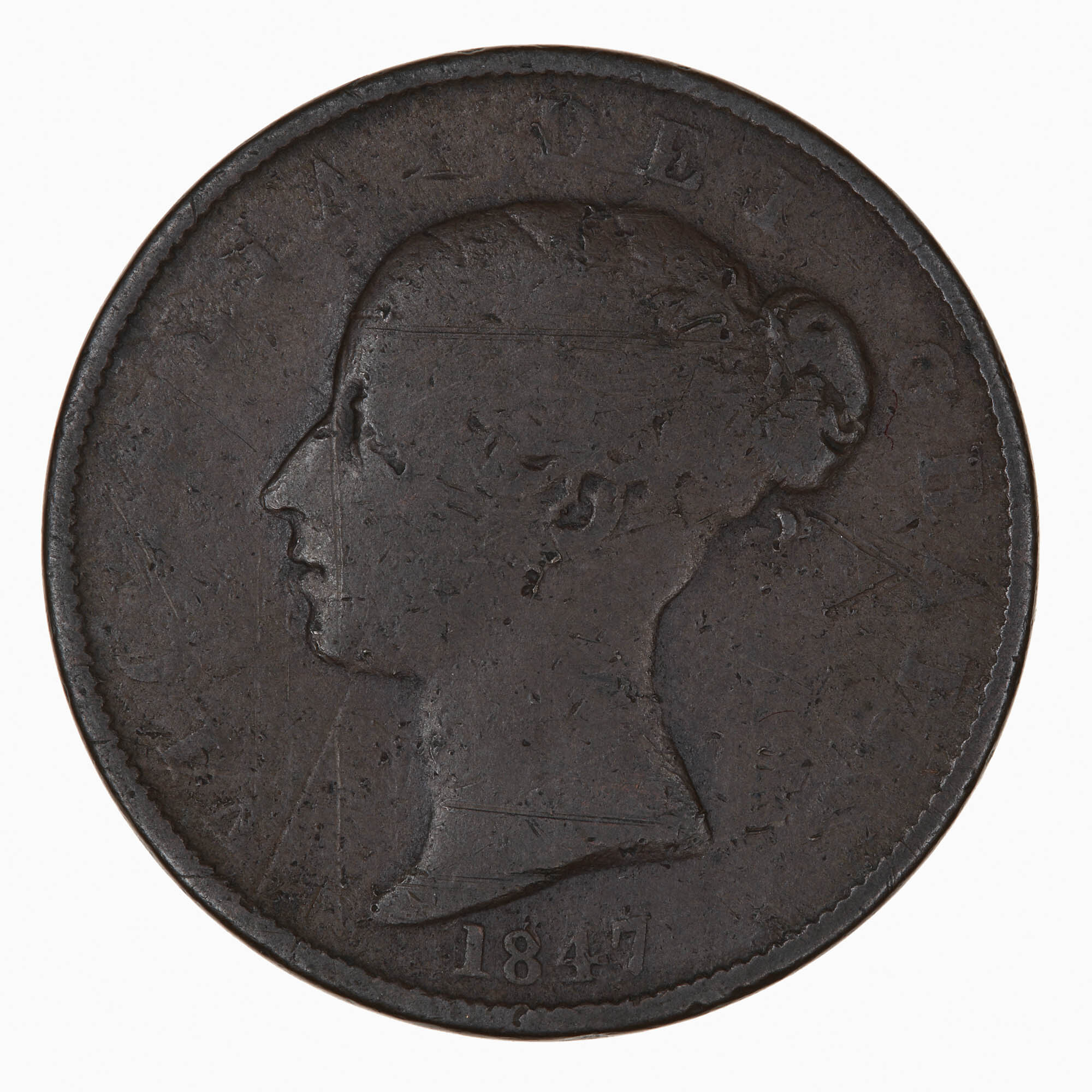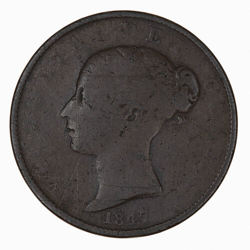 Head of the Queen facing left, hair bound in double fillet gathered behind in a knot from which a loose curl; on neck truncation incuse, W.W. (for William Wyon, who designed and engraved the dies); around, VICTORIA DEI GRATIA; below, 1847