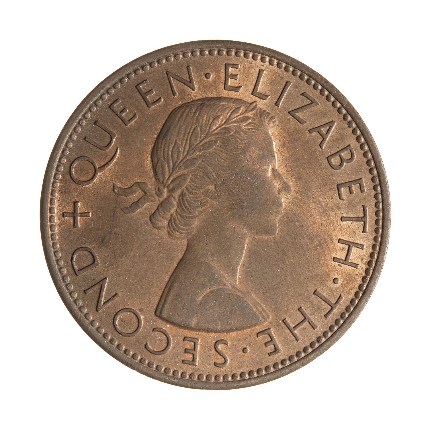 Laureate bust right; around, + QUEEN ELIZABETH THE SECOND; artist's initials incuse on neck truncation, MG (Mary Gillick)