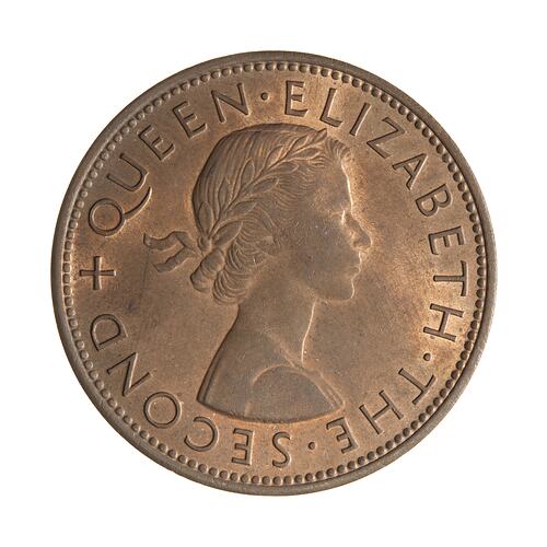 1 Penny, Issued by New Zealand, 1956 with shoulder strap