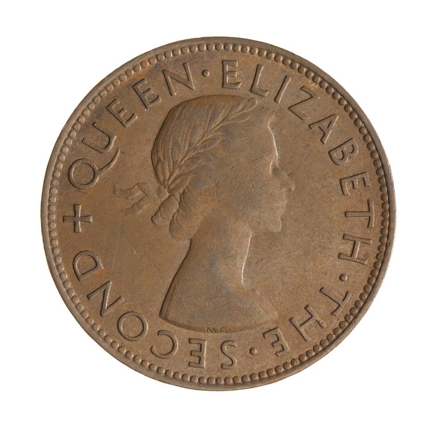 Laureate bust right; around, + QUEEN ELIZABETH THE SECOND; artist's initials incuse on neck truncation, MG (Mary Gillick)