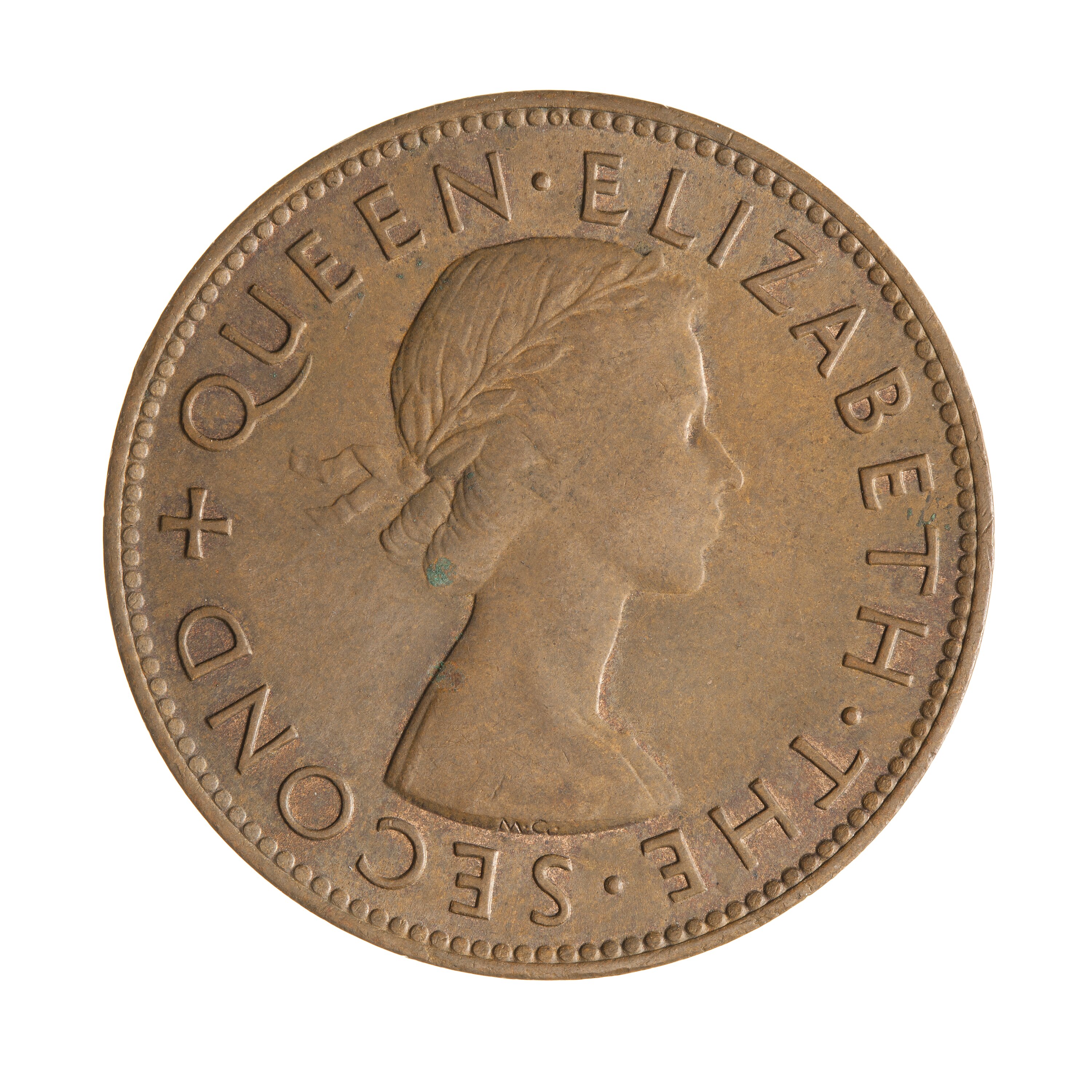 Laureate bust right; around, + QUEEN ELIZABETH THE SECOND; artist's initials incuse on neck truncation, MG (Mary Gillick)