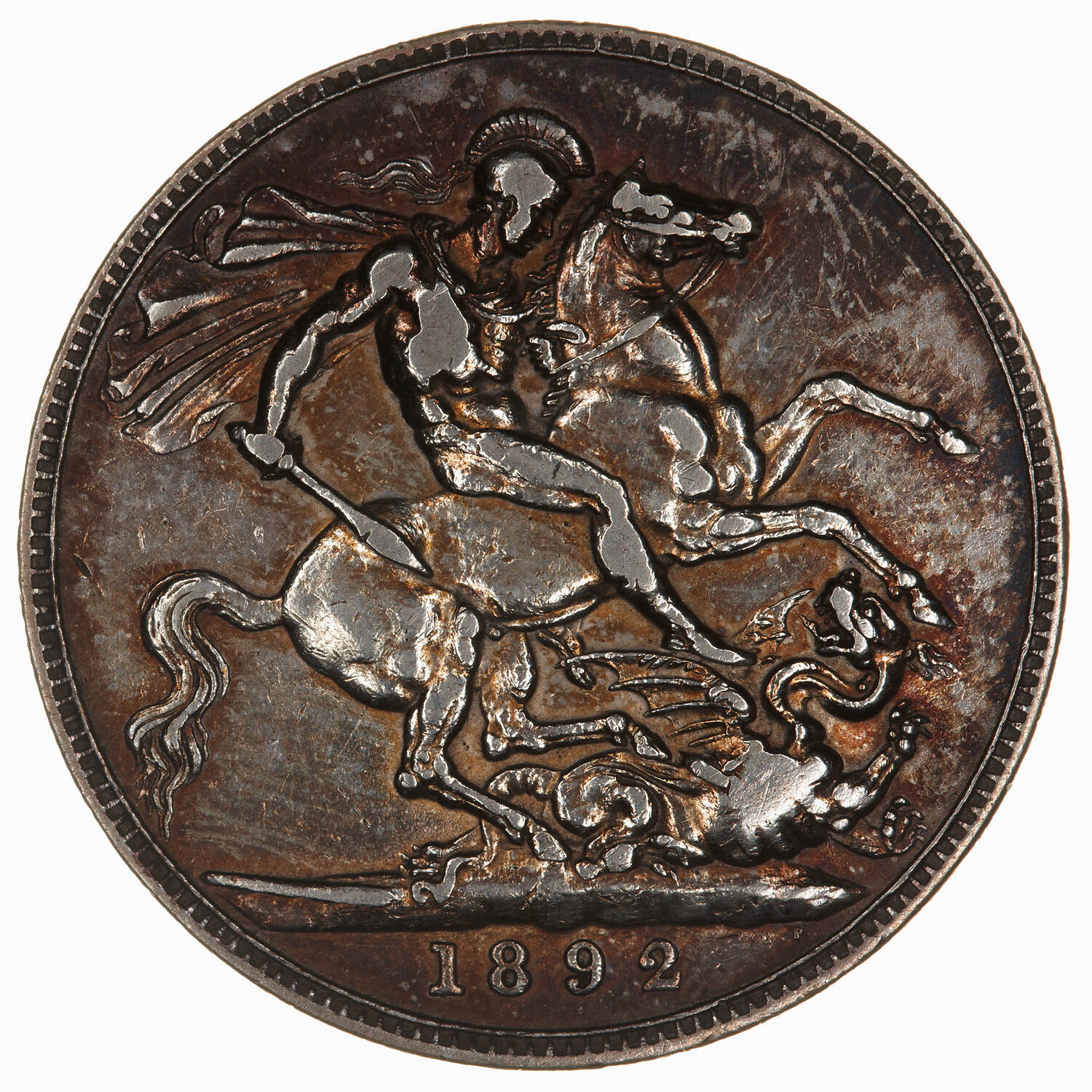 St George on horseback advancing to right wearing a helmet and cape and holding a sword; below horse, fallen dragon with lance in its side; below exergue line at right the artist's initials B.P. (Benedetto Pistrucci); in exergue, 1892