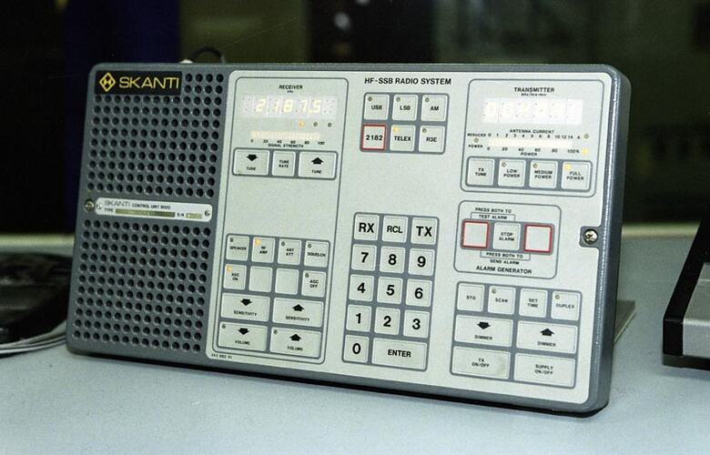 Photographic print showing Skanti transmitter control unit for digital selective call on top of operator's console operator's console. Melbourne Coastal Radio Station, Cape Schanck, Victoria.
