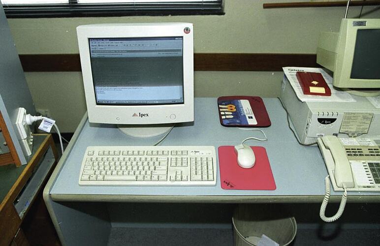 Photographic print showing operator's desk with computers and telephone. Melbourne Coastal Radio Station, Cape Schanck, Victoria.