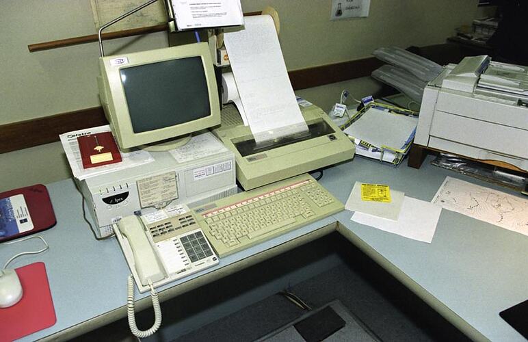 Photographic print showing operator's desk with computer and Telex machine. Melbourne Coastal Radio Station, Cape Schanck, Victoria.