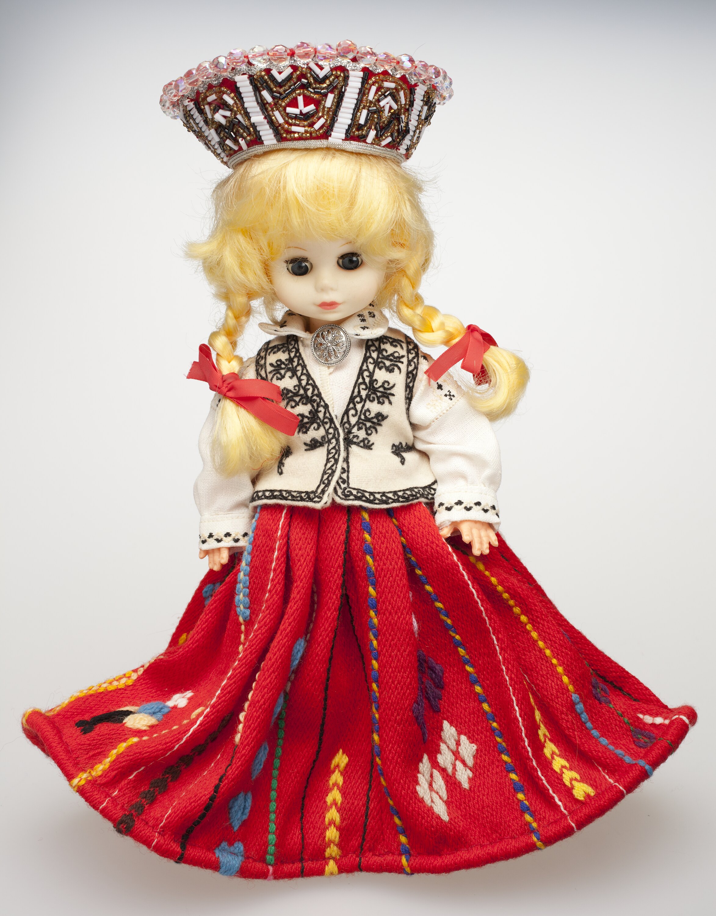 Doll dressed in traditional costume from the Nica Region of Latvia, made by Anita Apinis-Herman, circa 1980. Anita is second generation Latvian weaver, she was taught by her mother Anna Apinis then undertook further training at the Melbourne College of Textiles. The doll is dressed in the traditional garb of the Nica region from the West coast of Latvia. Mrs Logins in Perth, did the embroidery for the costume. The doll is dressed in the traditional garb of the Nica region from the West coast of Latvia. The red skirt is the brightest of all Latvian costumes.