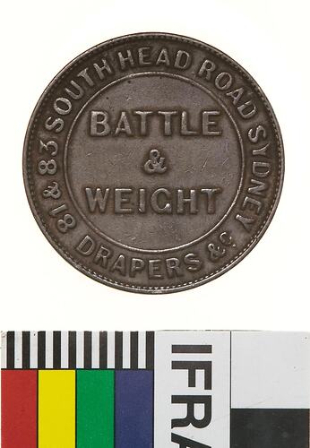 Obverse: BATTLE & WEIGHT 81 & 85 SOUTHEAD ROAD SYDNEY DRAPERS &c
