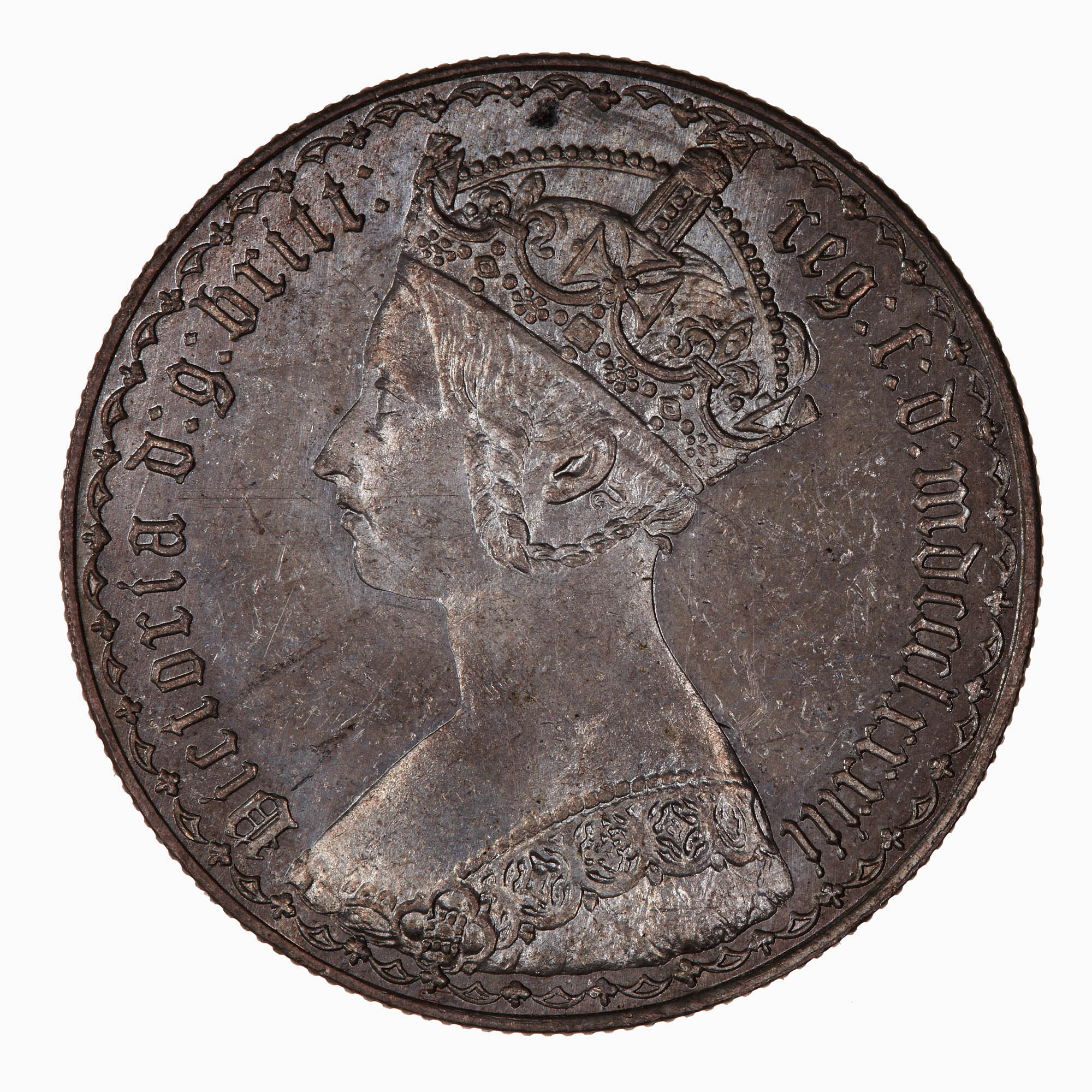 Crowned bust of the Queen facing left, the dress decorated with roses, thistles and shamrocks;around in Gothic letters, Victoria d: g: britt: reg: f: d: mdccclxxxiii