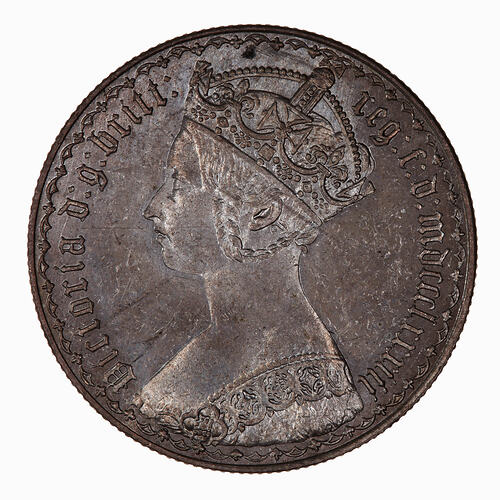The florin was introduced in 1849 as the first move towards decimalization of the British coinage, it was 1/10th of a pound or 2 shillings. This, the second type, is known as the "Gothic florin" because of the use of Gothic lettering in the legend.