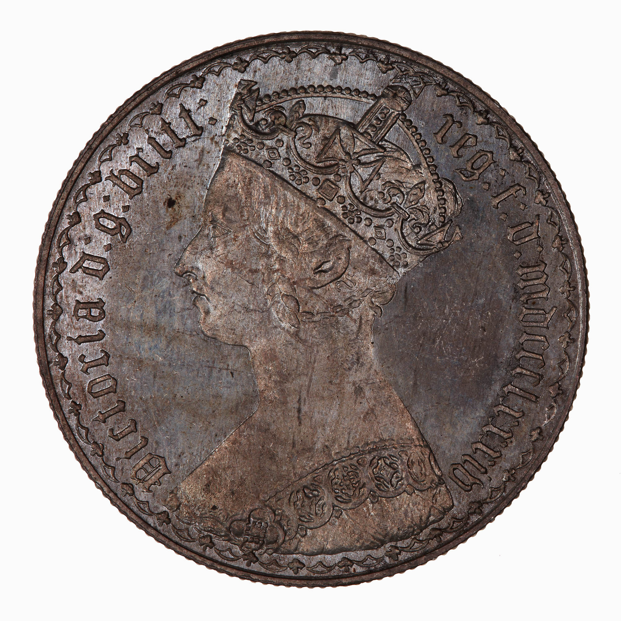 The florin was introduced in 1849 as the first move towards decimalization of the British coinage, it was 1/10th of a pound or 2 shillings. This, the second type, is known as the "Gothic florin" because of the use of Gothic lettering in the legend.