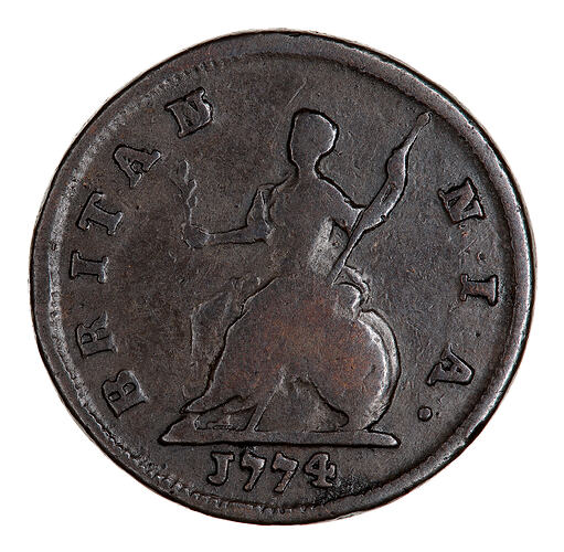 Britannia seated facing left on a globe, holding a spear and extending an olive branch, a shield rests against the globe at right; around, BRITANNIA.; in exergue, 1774