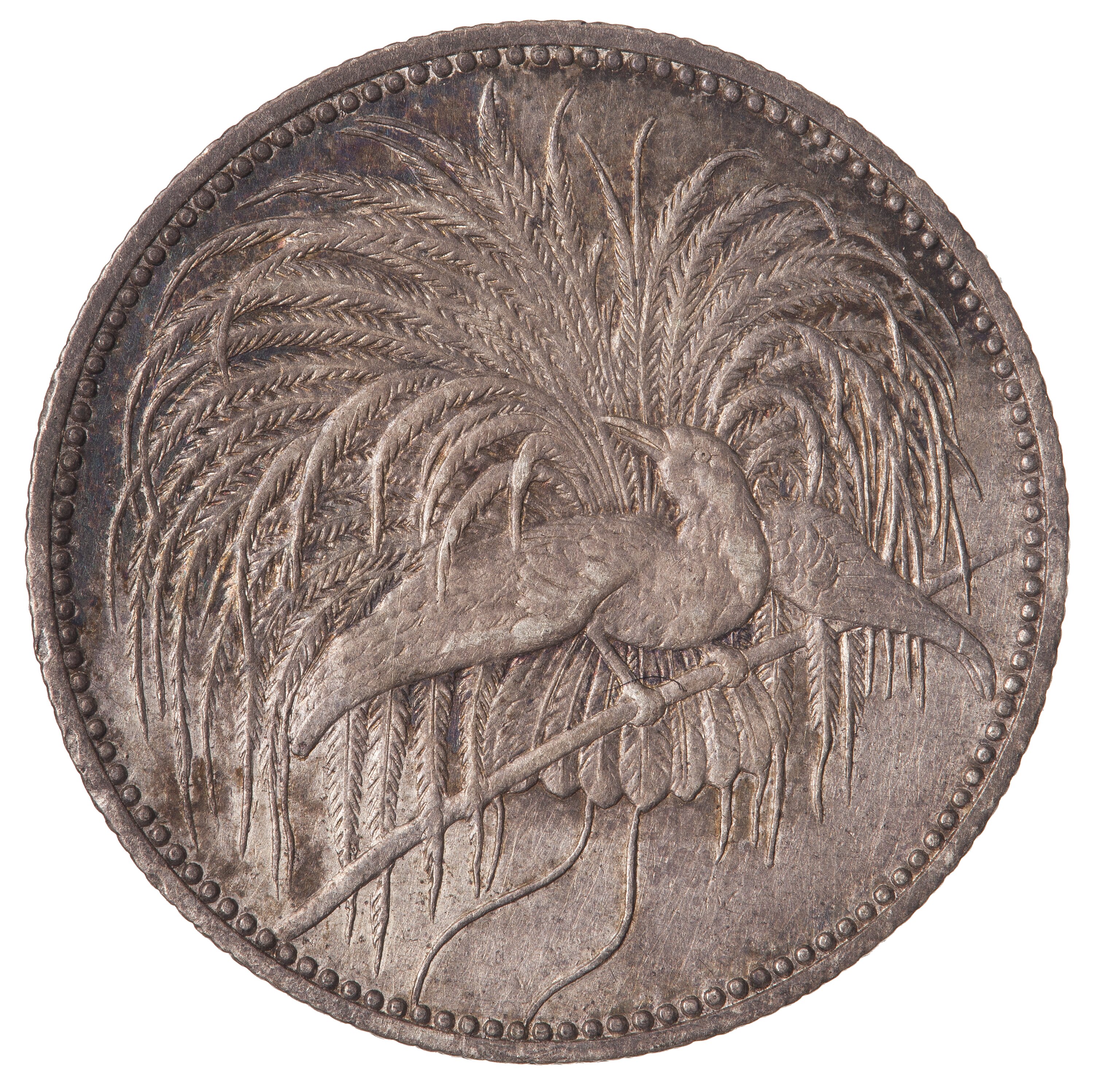 Silver 1 Mark coin issued by the German New Guinea Company. Struck at the Berlin mint, Germany. This coin was issued by the German New Guinea Company. This was a Chartered Company which had been formed in 1884 in Berlin to colonise and profit from north-eastern New Guinea. It had found it necessary to import workers from Java (who wanted payment in Dutch guilders), China and Japan (who wanted payment in Mexican dollars, a standard trad coin in Asia at that time). German, and to a lesser extent British coins was also in use in the area. To simplify this situation the Company sought permission to strike its own coins in 1891. Permission was not granted until 1894 with the stipulation that each denomination (excluding the bronze) was to match it's German Imperial equivalent. The coins were not however to bear the head of the German Emperor nor the German Eagle - they were the issue of the Company. The dies were prepared (engraved by Emil Weigand) and coins struck at the Berlin Mint. When they arrived in New Guinea all non German coins were withdrawn from circulation (the German 3 Mark and 20 Pfennig denominations were also excluded from circulation). No further production of coins was required as administration of the region was handed to the German Imperial Government in 1899, with German Imperial coins being imported. The Company coins ceased to be legal tender after 15 April 1911.