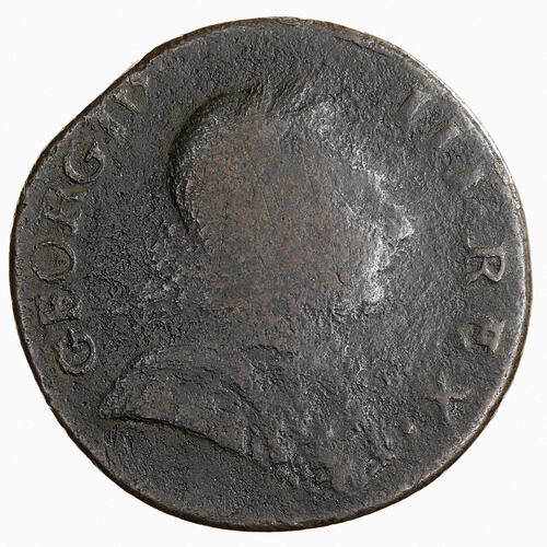 Laureate bust of the King facing right wearing armour; around, GEORGIVS III REX