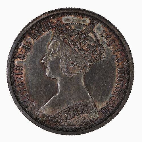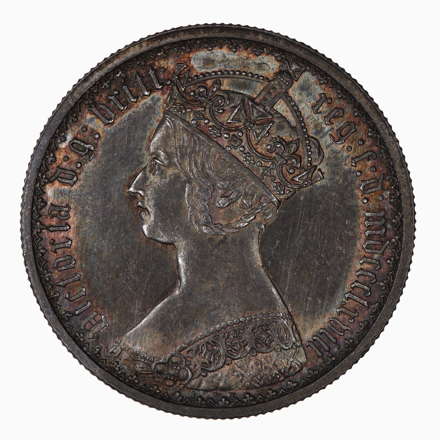The florin was introduced in 1849 as the first move towards decimalization of the British coinage, it was 1/10th of a pound or 2 shillings. This, the second type, is known as the "Gothic florin" because of the use of Gothic lettering in the legend.