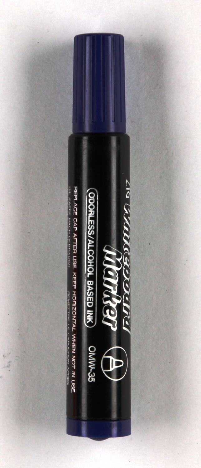 On side of pen: 'ZIG Whiteboard / Marker/ ODORLESS/ ALCOHOL BASED INK OMW-35 / REPLACE CAP AFTER USE. KEEP HORIZONTAL WHEN NOT IN USE / [Repeated in four languages] / KURETAKE CO. LTD MADE IN JAPAN / JAPON