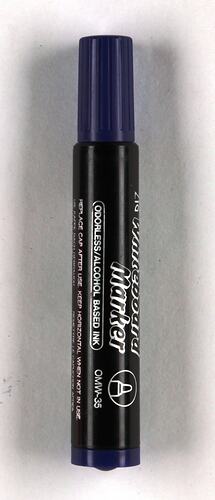 Blue marker pen with original blue plastic lid and end piece. The outer casing of the pen body is made from black plastic and has silver coloured writing along its length. The body of the pen is tubular, as is the lid.