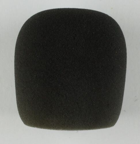 Black coloured foam/ sponge tubular shaped ball with large hole in the underside to allow sponge to be placed over microphone.