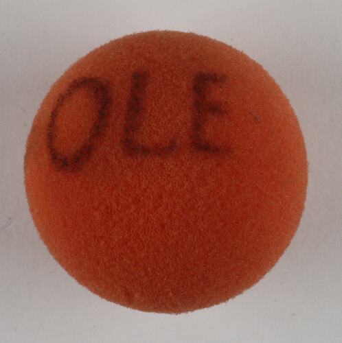 Orange coloured foam/sponge spherical ball that has a cruciform split on its exterior (part of sponge removed). The word 'OLE' is also written on the ball in black marker.