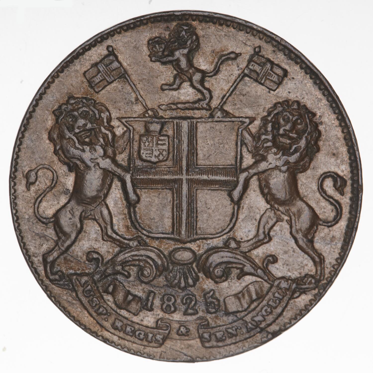Company arms, a quartered shield (crowned Royal shield in the first quarter of the shield else plain); crest of a helm with lion holding the Imperial Crown; lion supporters, each holding a banner charged with a cross motto below on ribbon, AUSP: REGIS & SEN: ANGLIAE (translation: under the auspices of the king and senate of England); above motto, 1825