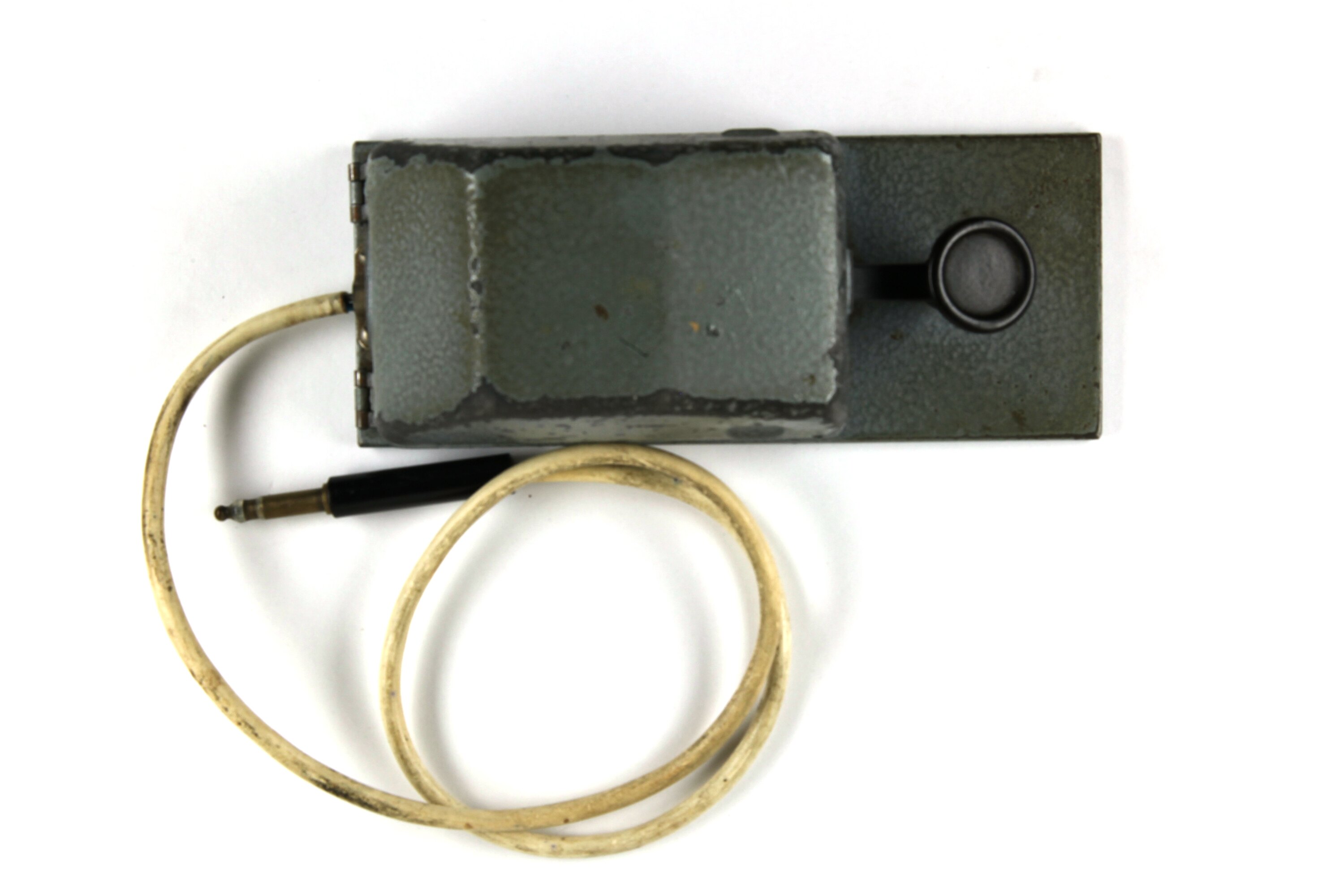 This morse key has a flip up metal cover and is mounted on a flat piece of sturdy metal. The exposed knob/button is fashioned from black plastic and has a raised outer rim. This button attaches to the spring loaded inner workings of the key which are mounted on a black plastic base out of which the connecting cable originates.
