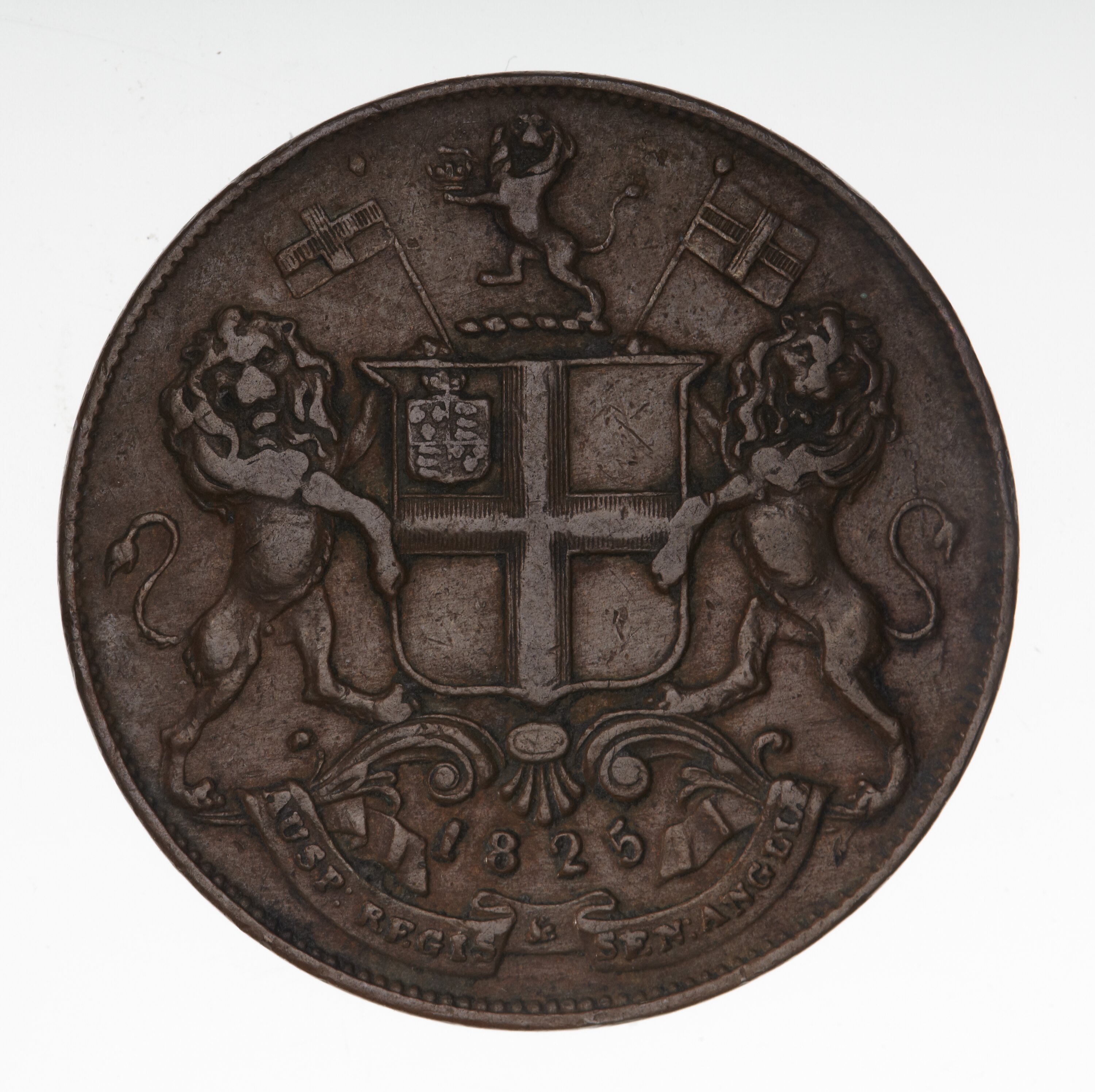 Company arms, a quartered shield (crowned Royal shield in the first quarter of the shield else plain); crest of a helm with lion holding the Imperial Crown; lion supporters, each holding a banner charged with a cross motto below on ribbon, AUSP: REGIS & SEN: ANGLIAE (translation: under the auspices of the king and senate of England); above motto, 1825