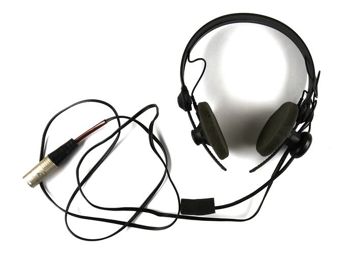 Black plastic headset. Has position-adjustable grey foam ear pads and a position-adjustable black plastic microphone with black foam padding, extending from bottom of one arm of the headset. Cable extending from each of the earpieces becomes one cord with a single connector.