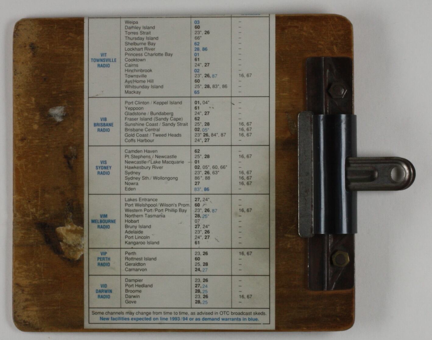 A wooden clipboard with a large black and silver metal clip at the top. A list of Australian seaphone channel frequencies is glued to one side, a map of Tasmania is sticky taped to the other side.