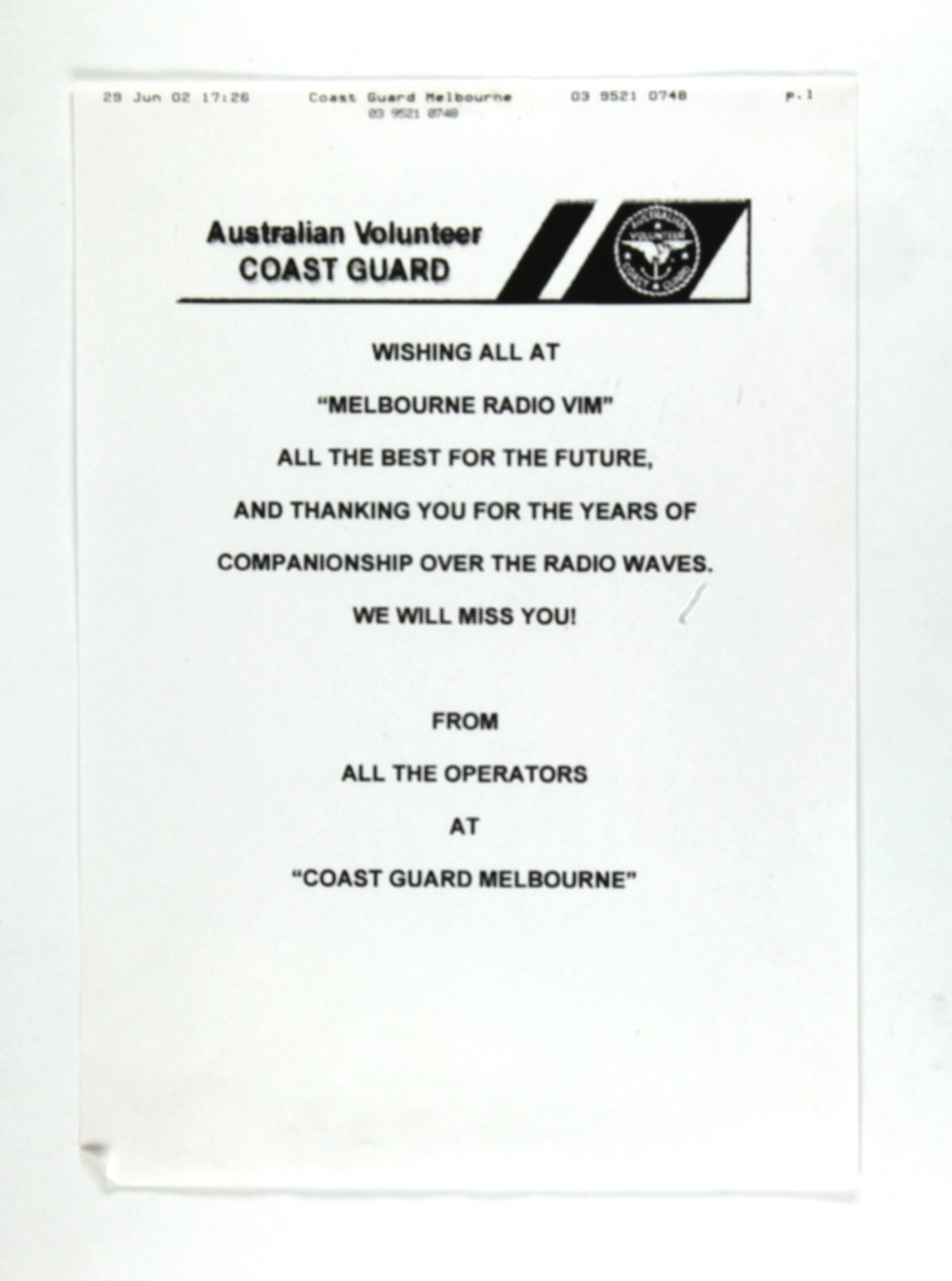 '29 Jun 02 17:26 Coast Guard of Melbourne 03 9521 0748 p.1/ 03 9521 0748/ Australian Volunteer COAST GUARD/ WISHING ALL AT THE "MELBOURNE RADIO VIM" ALL THE BEST FOR THE FUTURE, AND THANKING YOU FOR THE YEARS OF COMPANIONSHIP OVER THE RADIO WAVES. WE WILL MISS YOU! FROM ALL THE OPERATORS AT "COAST GUARD MELBOURNE" '