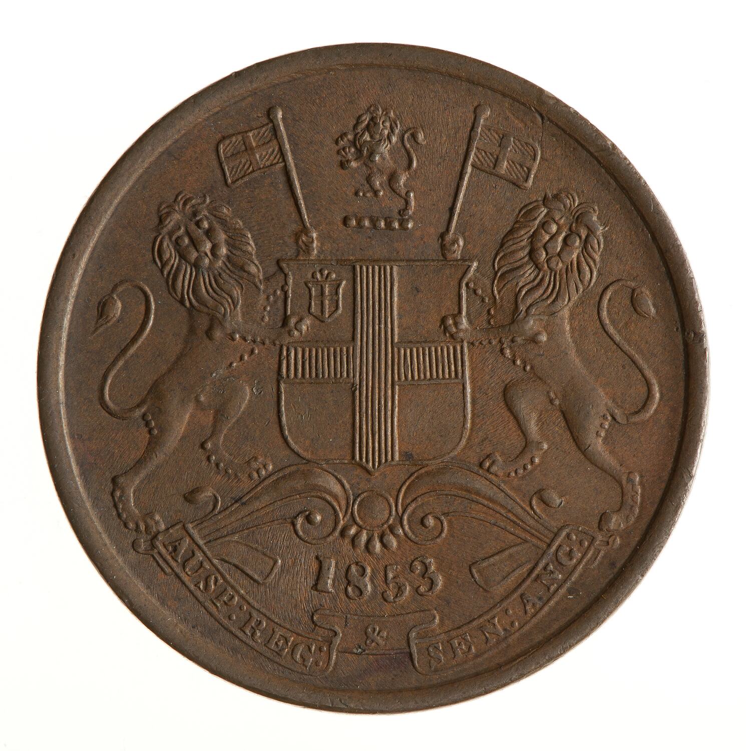 East India Company arms, a shield quartered with eschutcheon of France and England in the first quarter; crest of a lion rampant guardant holding between his forepaws the imperial crown proper; with supporters two lions rampant guardant each supporting a banner charged with a cross; below on a ribbon the motto, 'AUSP: REG: & SEN: ANG:' (translation: under the auspices of the king and senate of England); above ribbon, '1853'.