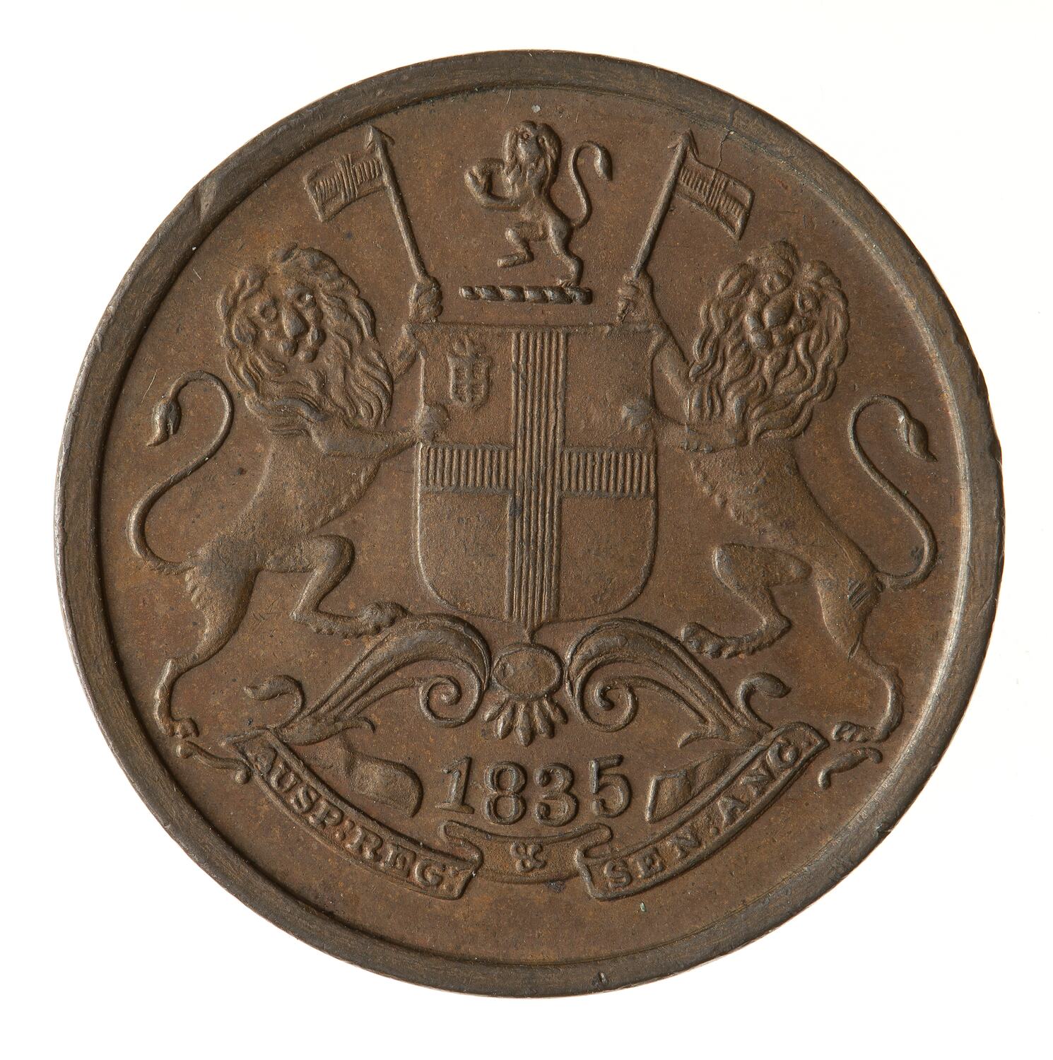 East India Company arms, a shield quartyered with eschutcheon of France and England in the first quarter; crest of a lion rampant guardant holding between his forepaws the imperial crown proper; with supporters two lions rampant guardant each supporting a banner charged with a cross; below on a ribbon the motto, 'AUSP: REG: & SEN: ANG:' (translation: under the auspices of the king and senate of England); above ribbon, '1835'.