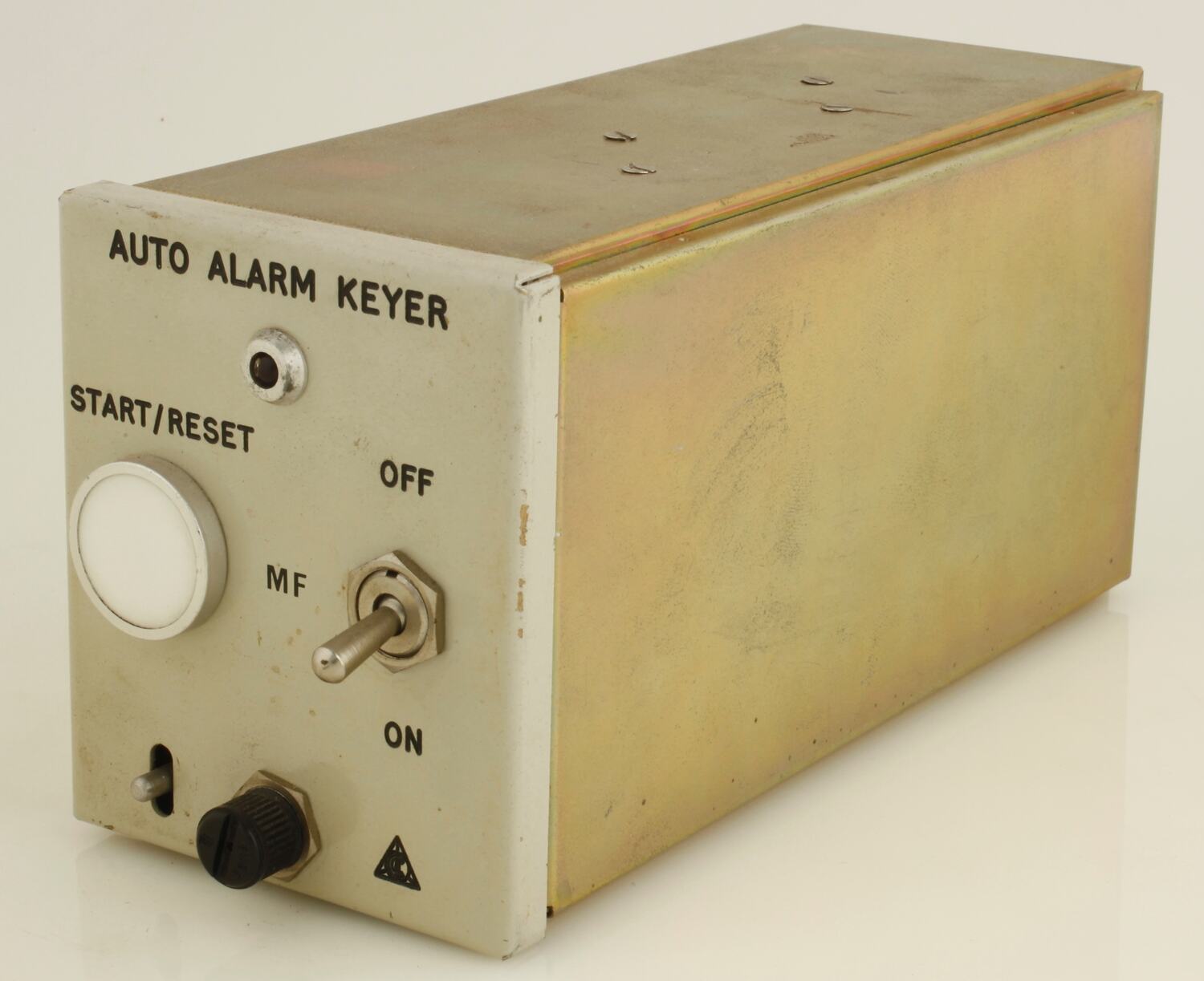 Markings on front panel: 'AUTO ALARM KEYER / START/ RESET / OFF / MF / ON' On rear panel: 'T21' On metal label adhered to rear panel: 'EQUIPMENT AUTOMATIC / ALARM KEYER / DRAWING No. (CI) 77-100-947 ISS 1 / MANUFACTURER CENTRE INDUSTRIES / DATE MTH-YR 7-77 / SERIAL & ITEM No. 00012'