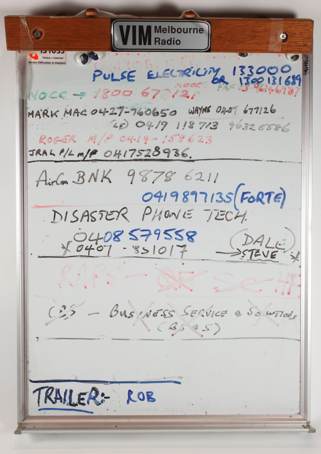 On label adhered to top right hand corner of whiteboard frame: 'Artline' On label adhered to top left hand corner of white board: 'T 131033 Telstra and International / Service Difficulties and Helpline' Handwritten on whiteboard: 'PULSE ELECTRICITY 133000 OR 1300131689/ NOCE 7 180067(?)121 NOCE FAX 0396146987/ MARK MAC 0427-760650 WAYNE O407 677126 (LS) 0419 118713 96325586 ROGER M/P 0419-158623/JRAL P/L M/P 0417528936/ AirCon BNK 9878 6211 0419897135 (FORTE)/ DISASTER PHONE TECH 0408579558 * 0407-851017 (DALE) > STEVE*/RAPS OF (crossed out) SC (crossed out) HF/ CBS (crossed out)- BUSINESS SERVICES (crossed out)...(unknown word, also crossed out)/ TRAILER: ROB'