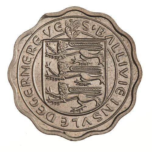 A Guernsey cow standing facing right; below, 1956; around above, GUERNSEY; around below, THREE PENCE; artist's initials, P.V., at right above the ground line